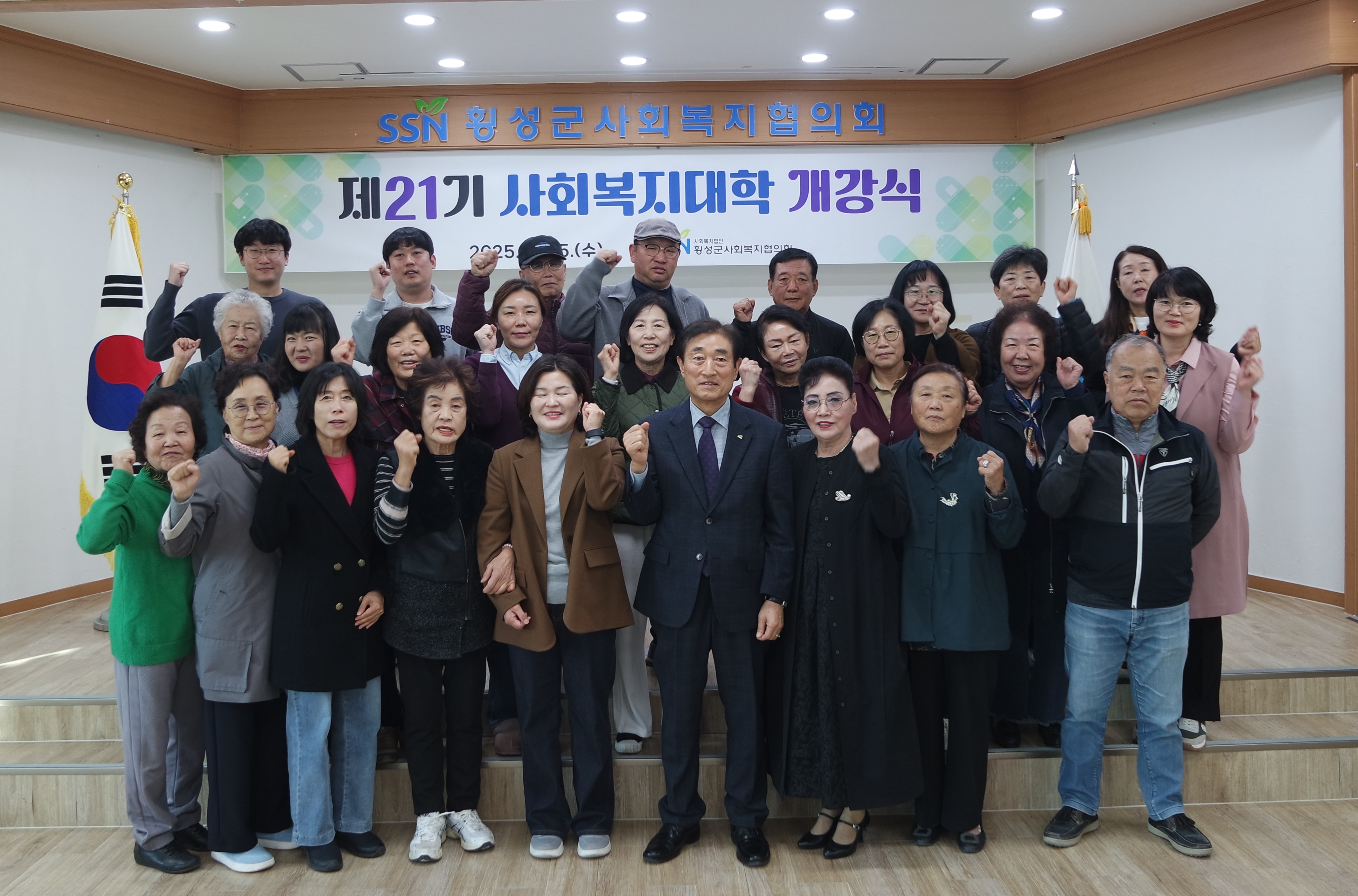 횡성군사회복지협의회(회장 이석원)는 횡성지역 사회복지 준전문가 양성을 위한 제21기 횡성사회복지대학 개강식을 진행하였습니다. 이석원 학장님의 인사말씀을 시작으로 횡성군청 장명희 과장님(복지정책과)께서 축사를, 그리고 김옥선 회장님(횡성사회복지대학총동문회)께서 격려사를 해주셨습니다.