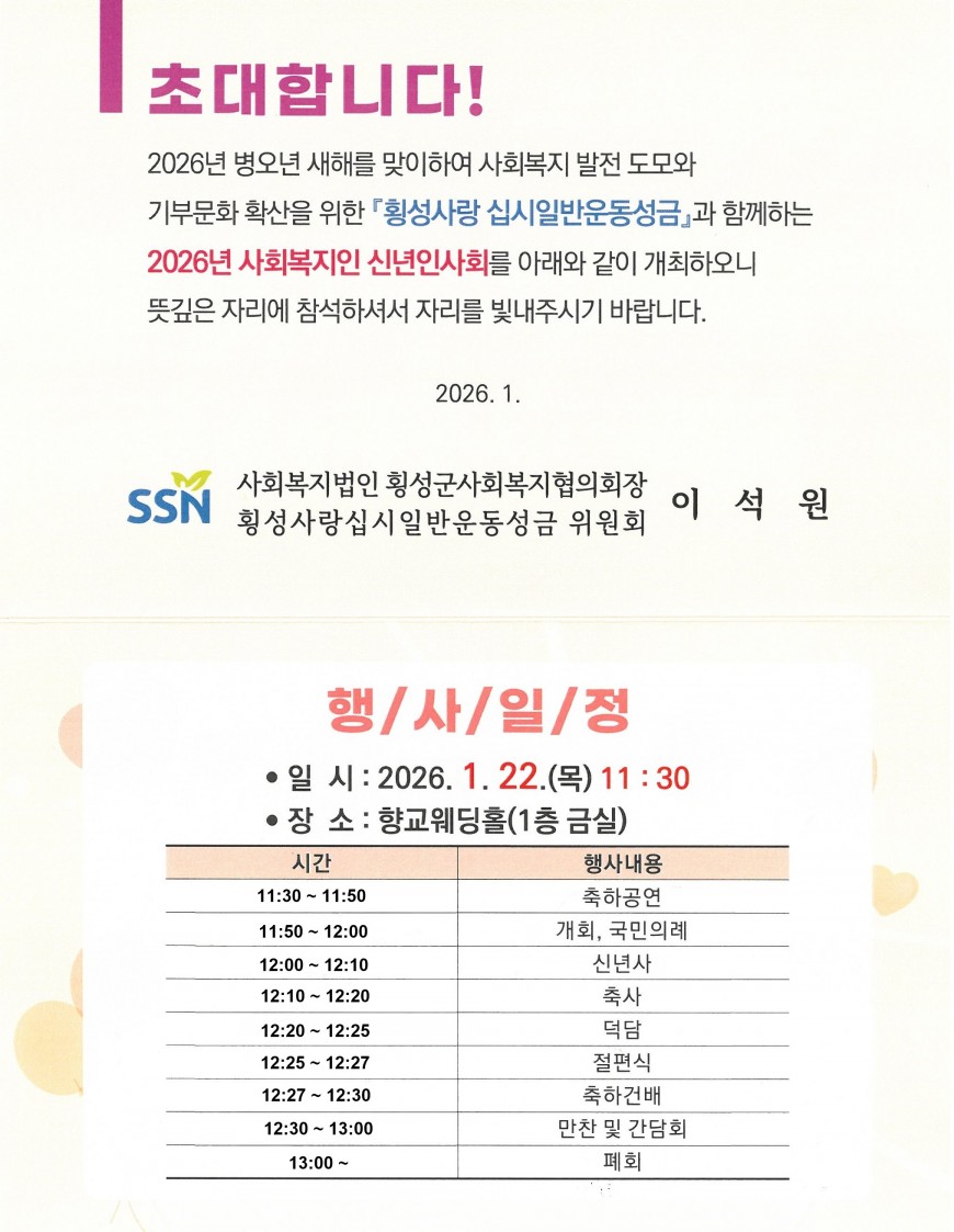 [횡성사랑십시일반운동성금]과 함께 하는 2026년 사회복지인 신년인사회를 개최함에 따라