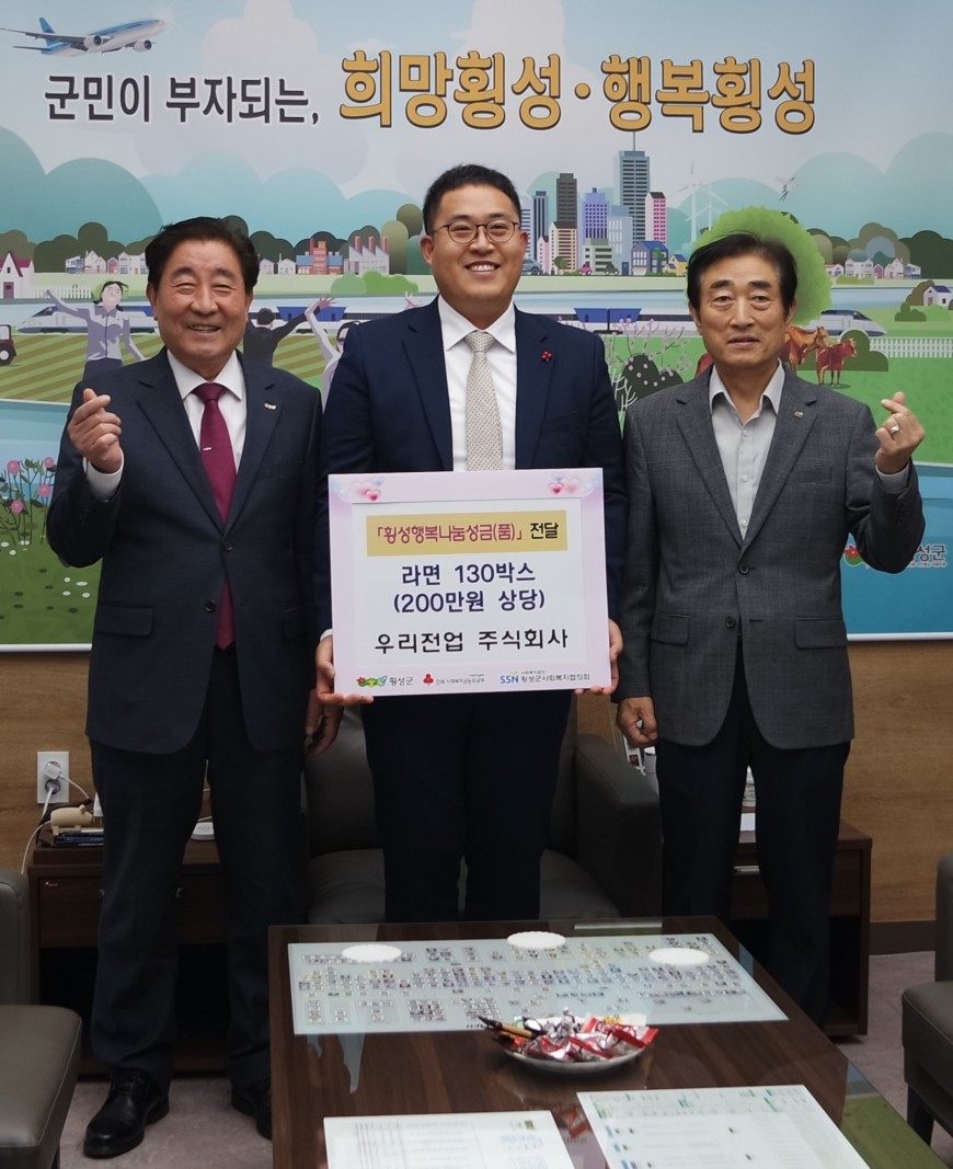 【주)우리전업】에서 『횡성행복나눔성금』으로 성품을 기탁해주셨습니다. 소중한 후원 진심으로 감사합니다.